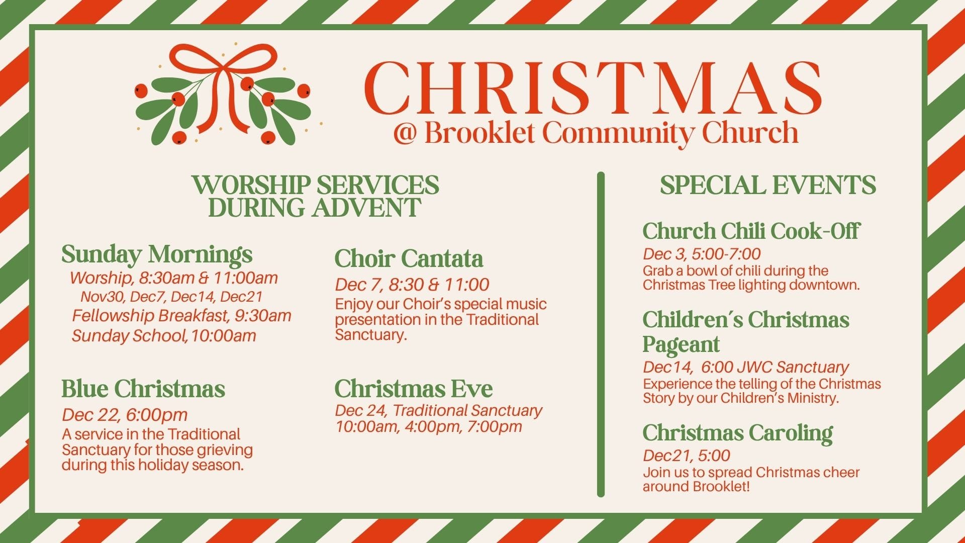 Join us at Brooklet Community Church this December as we celebrate the Advent season with a series of worship services and special events. Advent is a time of anticipation and reflection, and we have a full schedule planned to help you and your family prepare for Christmas. Whether you’re a regular attendee or new to our community, we welcome you with open arms to experience the joy and peace of this special time of year.